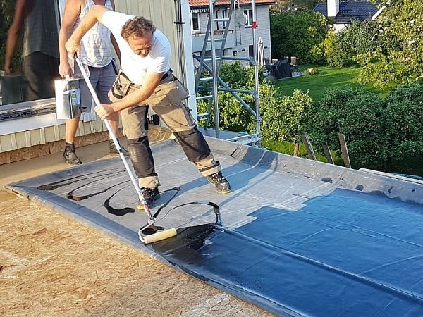 2. Dicht- und Klebstoffe (Kraftkleber) dichten die Dachbahn am Rand wasserdicht ab.