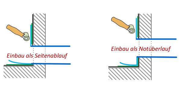 Flex-Gully als Seitenablauf/Notüberlauf: Durch den flexiblen Systemflansch ist der Flex-Gully sowohl als Seitenablauf als auch als Notüberlauf mit flexibler Anstauhöhe installierbar. Der Einbau mit Grundierung erfolgt gleichermaßen wie beim Einbau als Dachgully.