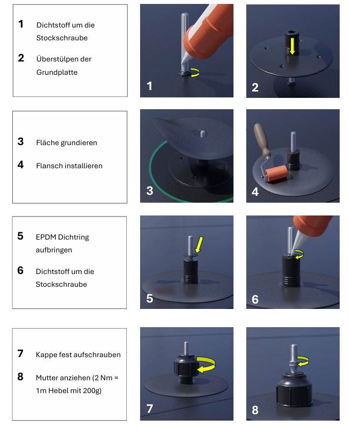 Patentangemeldet - professionelle Befestigung auf Flachdächern - mit 3-facher Sicherung.