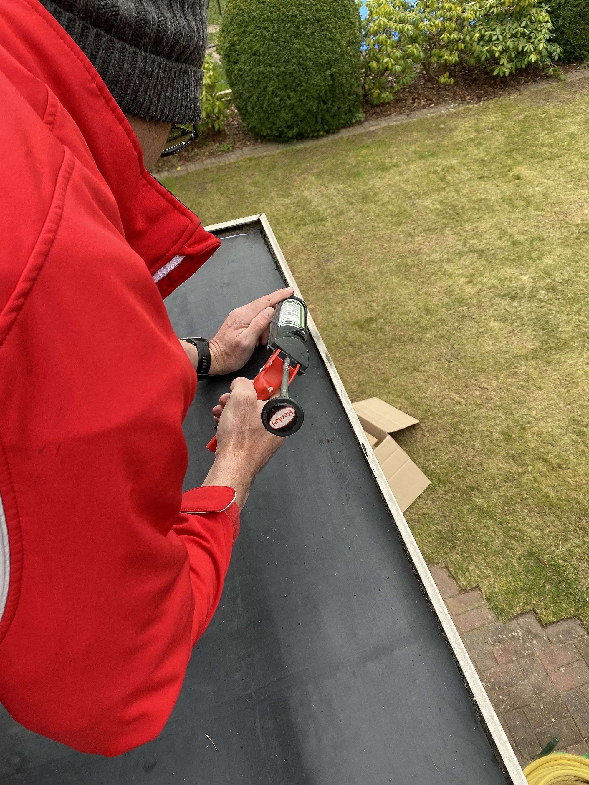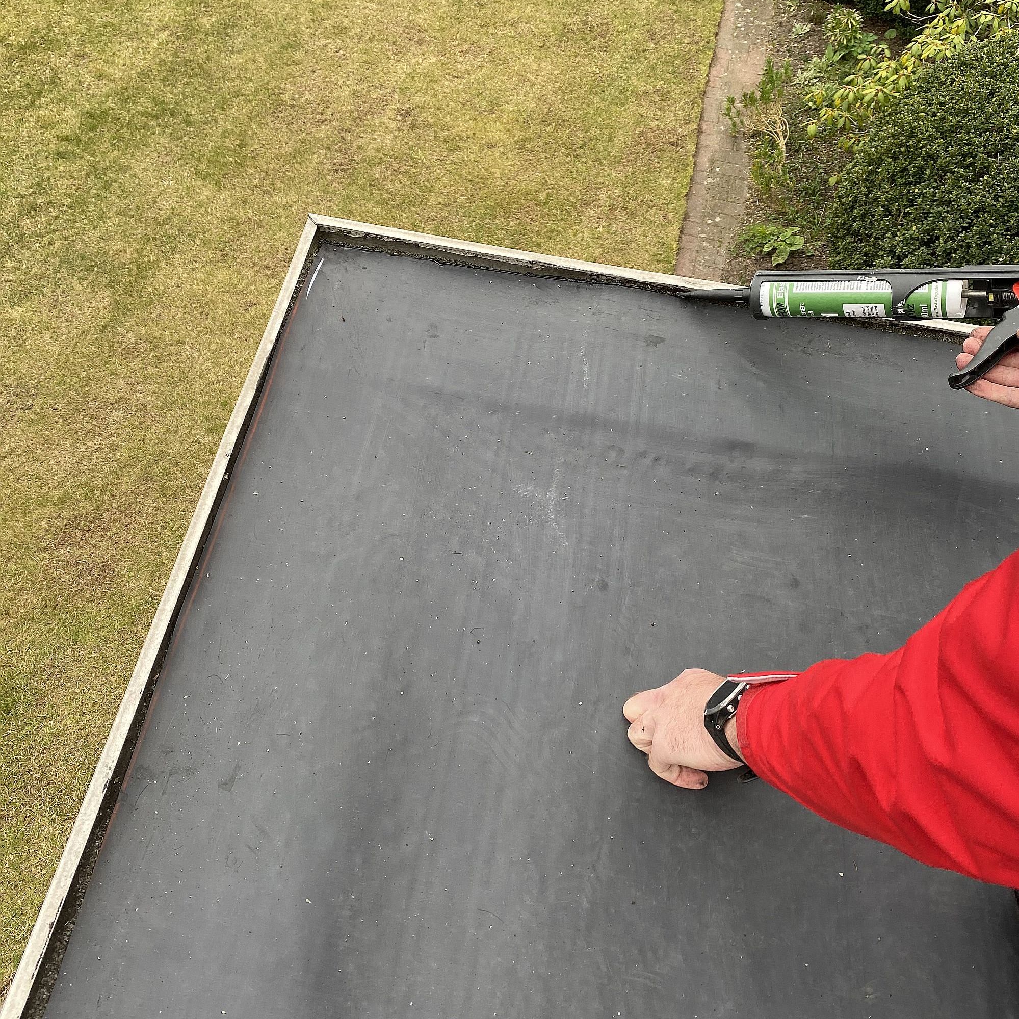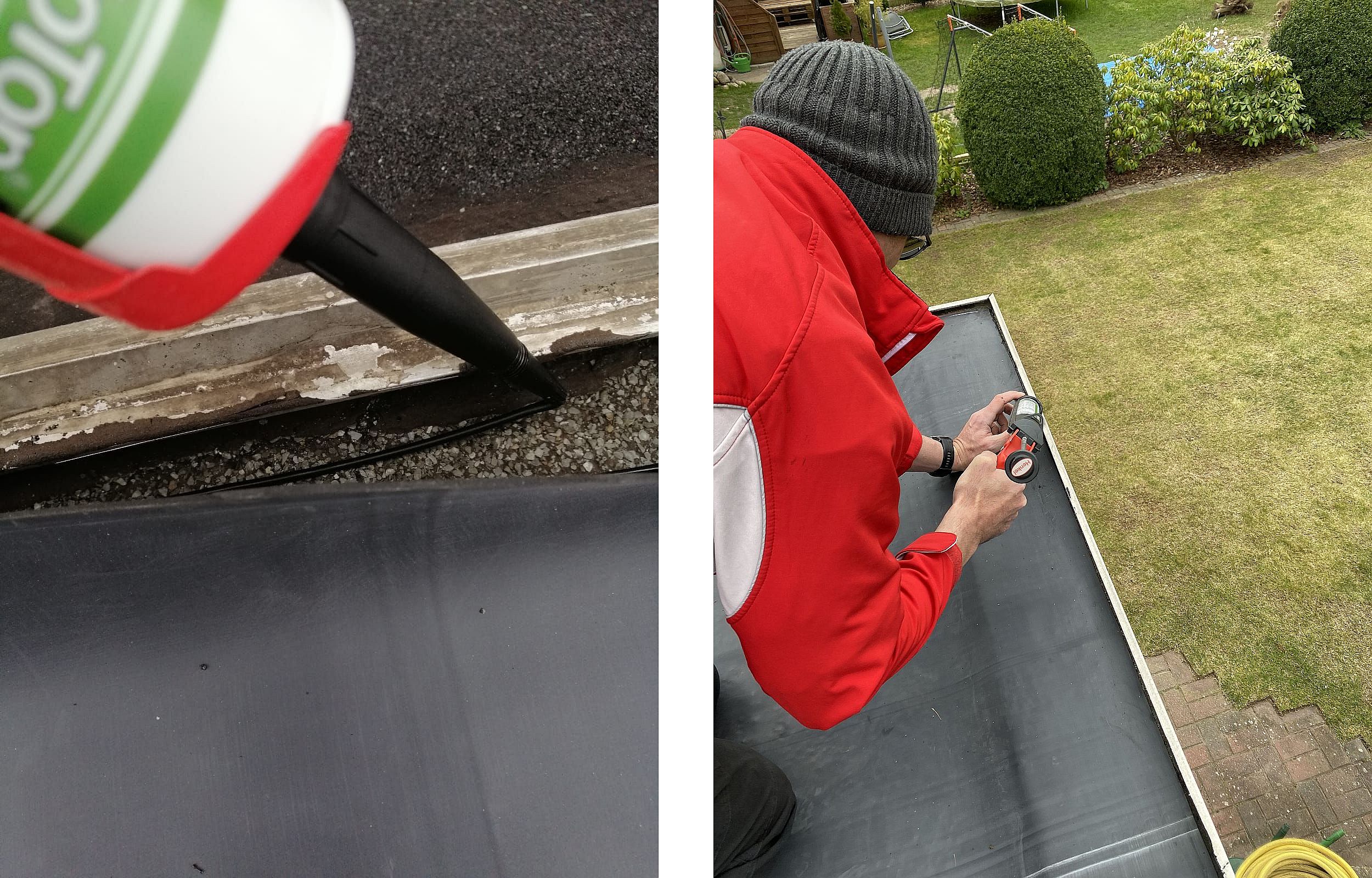 Der Flächenkleber wird bis ca. 4 cm vor dem Rand der Bahn eingesetzt, dann sichert eine Raupe von dem Kraftkleber die Bahn wasserdicht ab (am Rand tritt etwas Kraftkleber heraus).