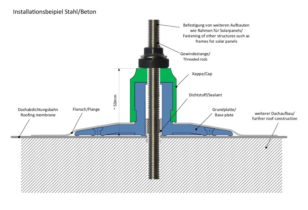 Mit Stockschrauben gesicherte Bauteile wie Solar-Module auf flachen Dächern.